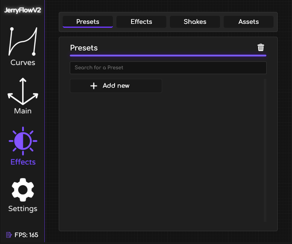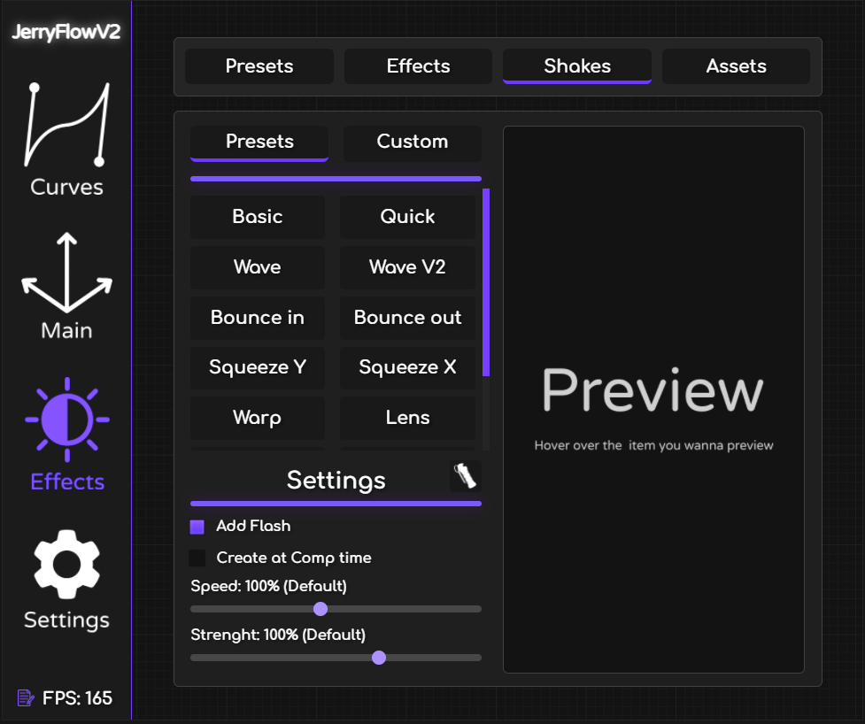 Access a variety of pre-made shakes from the previous JerryShakes product, now improved and expanded. These shakes are customizable in terms of duration and strength, with an option to add a "Flash" effect for extra impact. Some of the popular shakes included are: